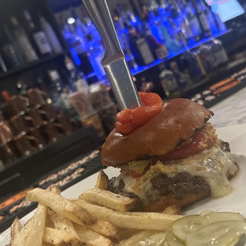 Seasoned 8 oz. Hand Pressed Burger, Fresh Tomato, House Made Relish, Black Garlic Aioli, and Fontina Cheese, Served on a Grilled Sweet Potato Roll